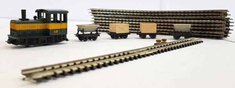 Roco / Minitrains 3009 - Zugset Feldbahn - Diesellok nr. 12 - 4 Feldbahn Güterwagen - Schienenoval - H0e