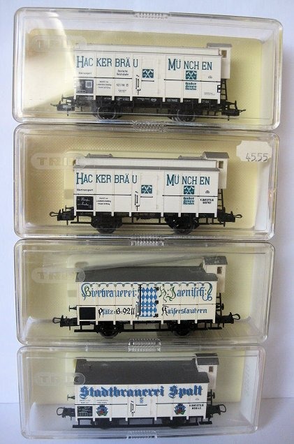 Trix 33519 / 23532 / 23618 / 52 3646 00 - Modeltrein goederenwagon 4 Stuks - 4 x Bierwagens met remmershuisje - DR ( Epoche 1 ) - K.Bay.Sts.B. - H0